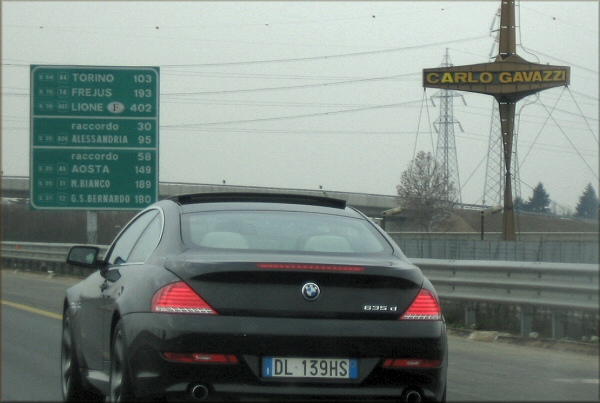 En venant de Bergame, une fois passé Milan / Milano, la France se rapproche subitement comme l'indique ce panneau mentionnant le tunnel du Frejus, Lyon mais aussi le Mont Blanc et le Grand Saint Bernard ainsi qu'Aoste / Aosta et Turin / Torino.